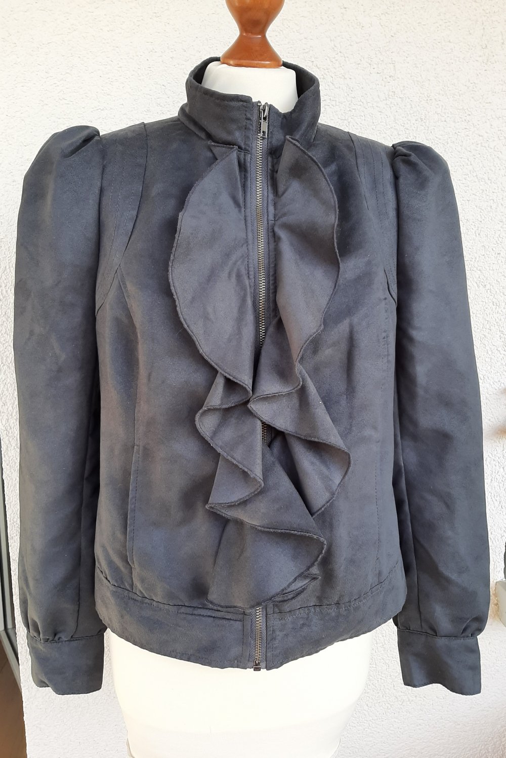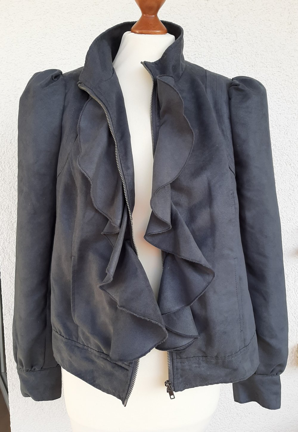 Tolle, kastig geschnittene Jacke von F&F by Asos aus samtigem Wildleder-Imitat mit voluminösen Schultern, Dolmanärmeln und Volants. Ungetragen, da sie mir leider nicht richtig passt; UK14 passt hier einer 40 oder schmalen, d.h. nicht zu kurvigen, 42. Hoher Neupreis.