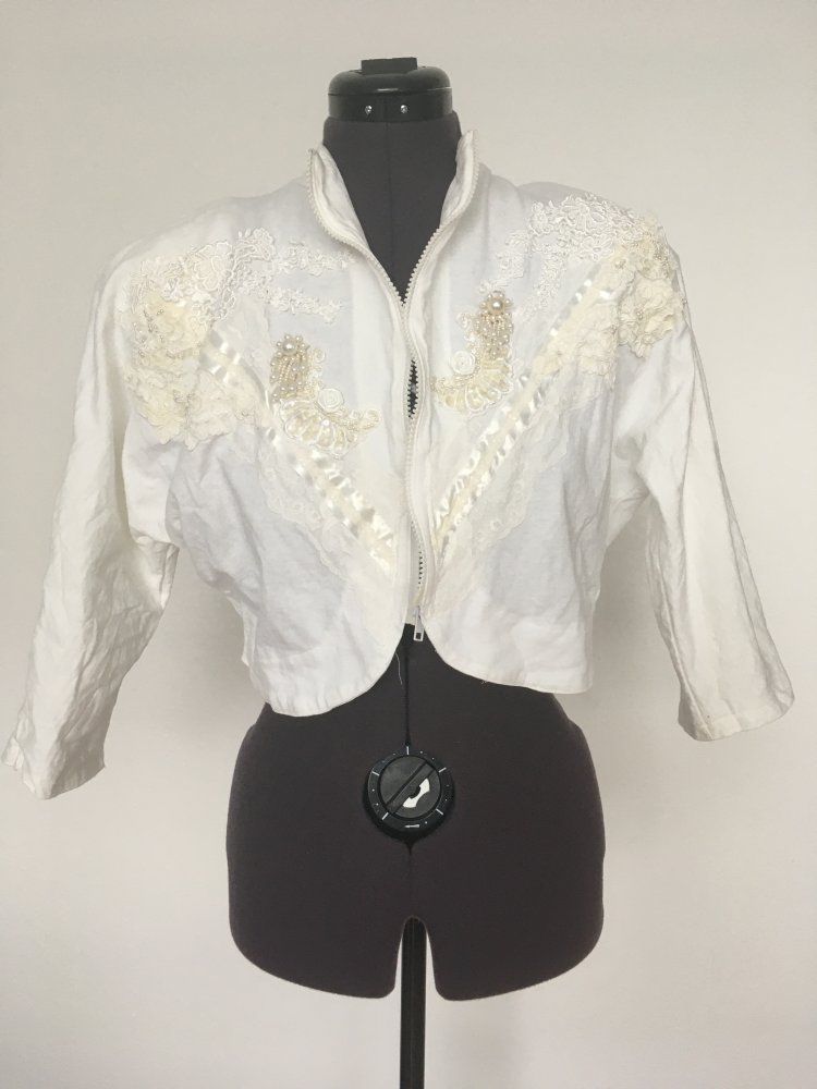 #vintage #jacke #reissverschluss #perlen #weiß #white #baumwolle #cotton #groesse34 #groesse36 #bolero #bomberjacke #applikationen #spitze #80er #80ies #90er #90ies