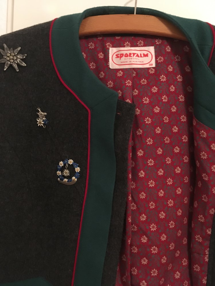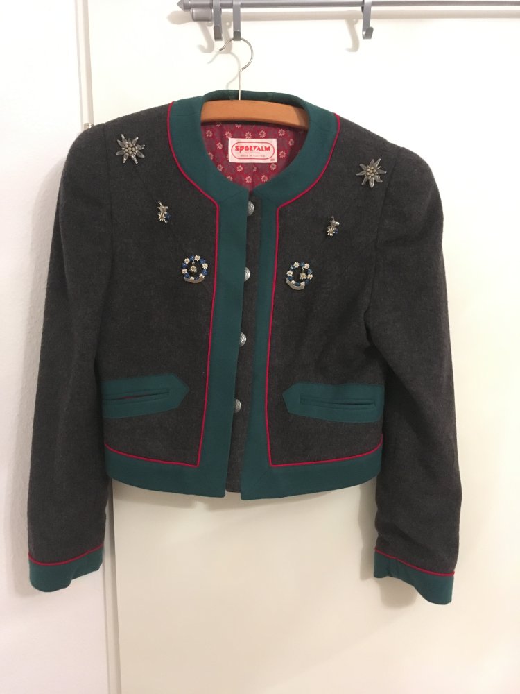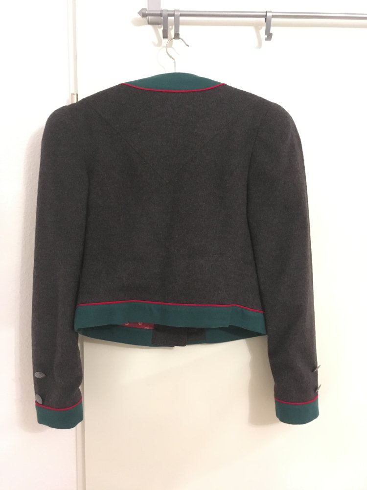 Grau-grün-rote Trachtenjacke, gefüttert mit abnehmbaren Broschen und kleinen Taschen.