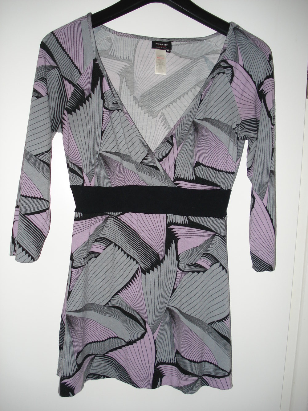 Dieses schöne Longsleeve von Miss Sixty sitzt super bequem und angenehm durch den Stretchanteil. Es steht Größe M drin und passt wie eine 38. Durch das extravagante und ausgefallene flieder-grau-schwarze Muster ist das Teil ein echter Hingucker.