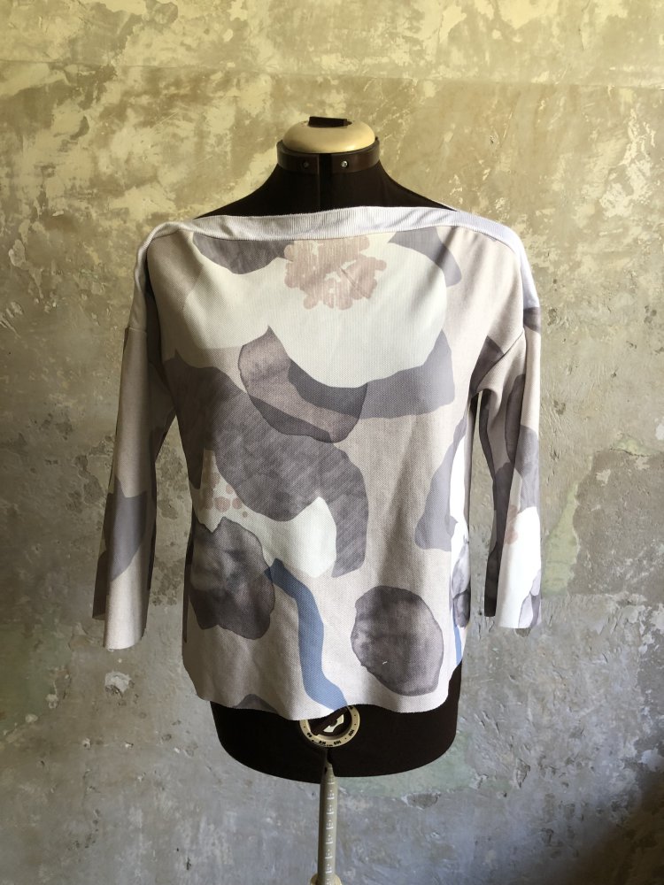 Schönes bequemes Oberteil. Passt zu sportlich eleganten Outfits für die Arbeit. Ärmel wie auch Oberteil im ganzen weit geschnitten. Saumenden nur geschnitten nicht versäubert, trotzdem nicht Gefahr durch ausfransen. Muster ist aquarellartig