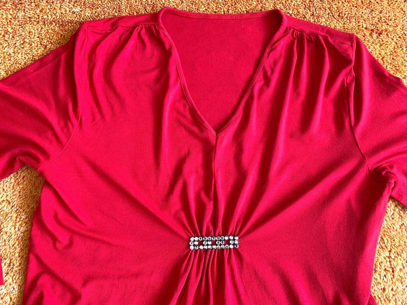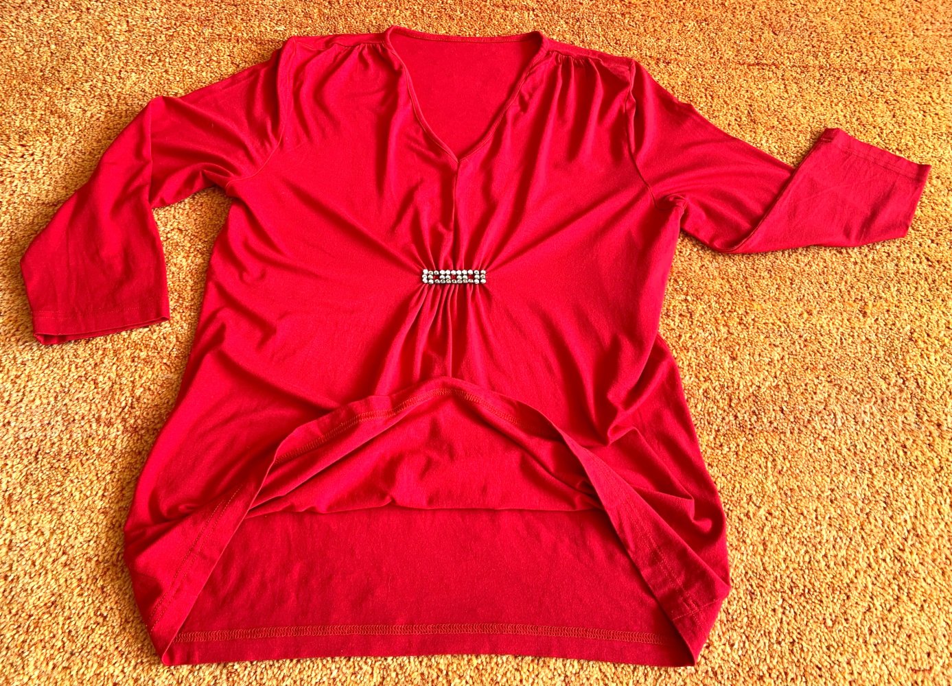 Dieses rote Longshirt begeistert mit femininer Raffinesse und hohem Tragekomfort. Ein glänzendes Glitzerelement betont die vordere Raffung und verleiht dem Shirt eine stilvolle Note. Der lässige Schnitt in Kombination mit den 3/4-Ärmeln sorgt für eine entspannte Passform – ideal für angesagte Stylings mit Jeans und Boots.
