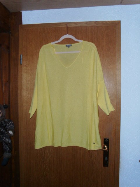 Biete hier ein Langarmshirt von Gina Laura in Größe 50/52 an. Es ist mit Gr. XXL angegeben und wurde in oben genannter Größe getragen. Das Shirt ist schlicht gelb, ein schönes kräftiges Gelb und besteht aus einem Viskosegemisch. Die 3/4 langen Ärmel sind leicht Fledermausartig geschnitten. Links unten befindet sich ein kleines rundes angenähtes Emblem. Das Shirt wurde selten getragen und ist sehr gut erhalten.