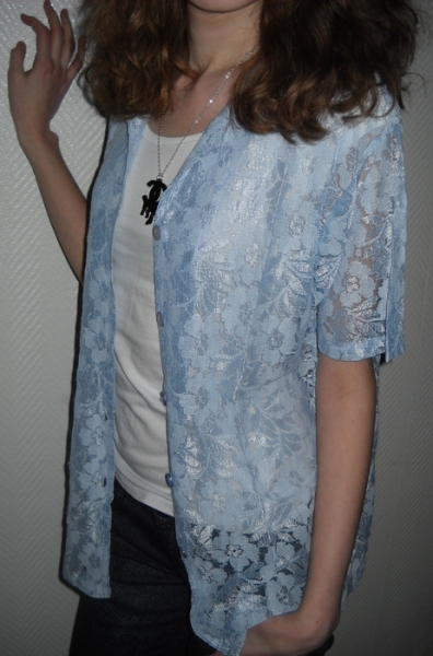 Long Bluse aus Spitze Tunika Top Shirt Spitzenbluse blau mittel Kurzarm Kragen oversized 34 36 38 XS S M