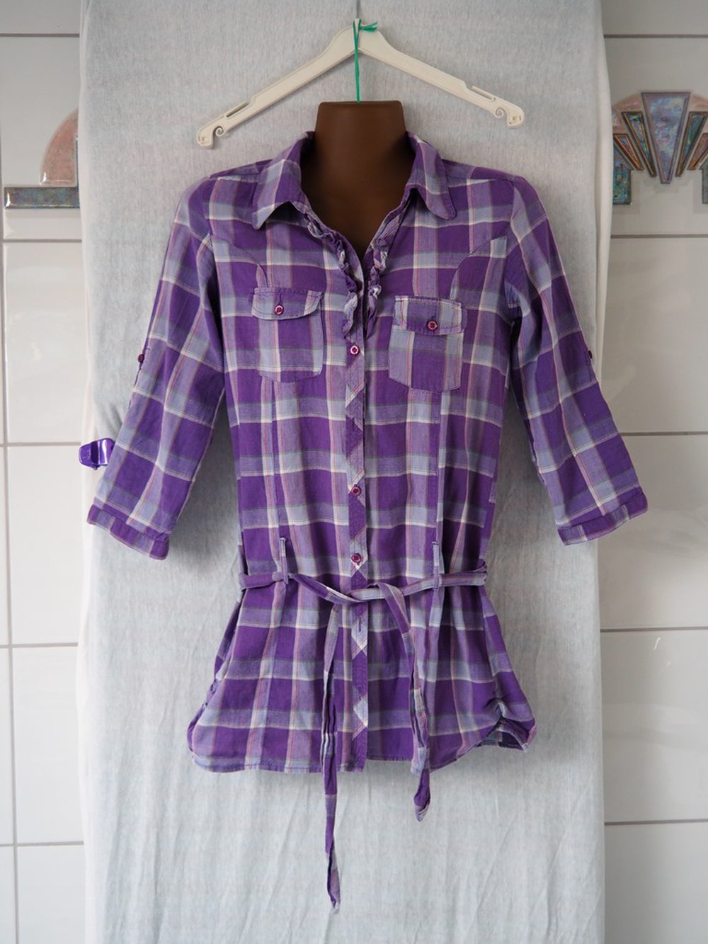 Schöne Longbluse mit lila/ violetten Karos und einem taillierten Gürtel. Sie hat eine Knopflieiste und auf Brusthöhe auf jeder Seite eine kleine Tasche zum Zuknöpfen. Sie hat einen leichten Kragen und um den Ausschnitt herum Rüsschen an der Knopfleiste. Unten an den Seiten hat sie eine Gummiraffung, so fällt sie super schön und macht eine super Figur. Der Gürtel ist am Rücken festgenäht und auch der Rücken ist schön geschnitten und hat auf Schulterhöhe auch leichte Faltenwerfungen. Die Ärmel kann man entweder in dreiviertel tragen oder hochraffen zu T-Shirt länge. Sie hat einen leichten Vokuhila-Schnitt und ist deshlab hinten etwas länger und geht bei mir (größe 36, ca. 172cm) knapp über den Po. Die Longbluse hat die Größe 176 und ist von der Marke Hot&Spicy. Ich empfehle sie auch einer Größe 34 mit dünnen Armen, da sie mir mit 36 zwar noch passt aber an den Armen etwas engt wird. Die Karos sind groß und bestehen aus lila, weiß, rot und grün. Die Knöpfe schimmern in lila.
