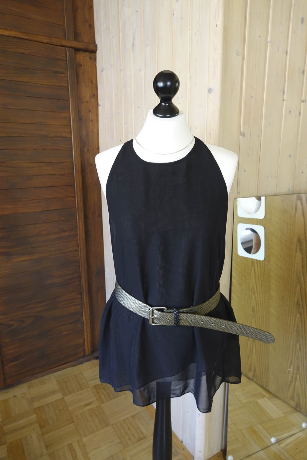 Sehr schickes Oberteil, ohne Ärmel, hinten ist ein Reißverschluss, es fällt locker und kann mit oder ohne Gürtel getragen werden. nur 1x getragen, (es wird ohne Gürtel verkauft)
