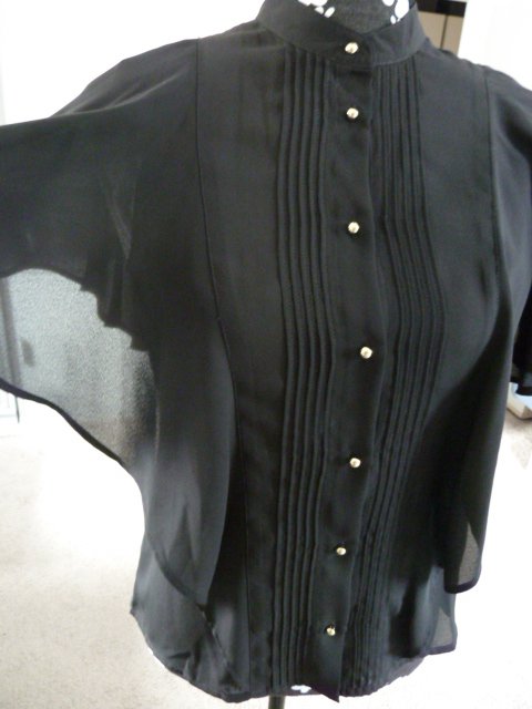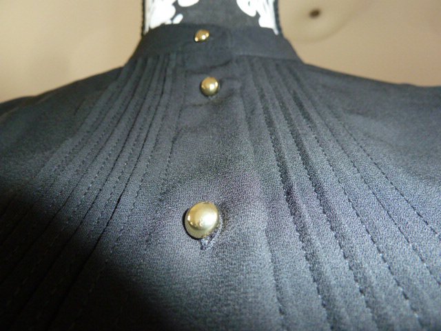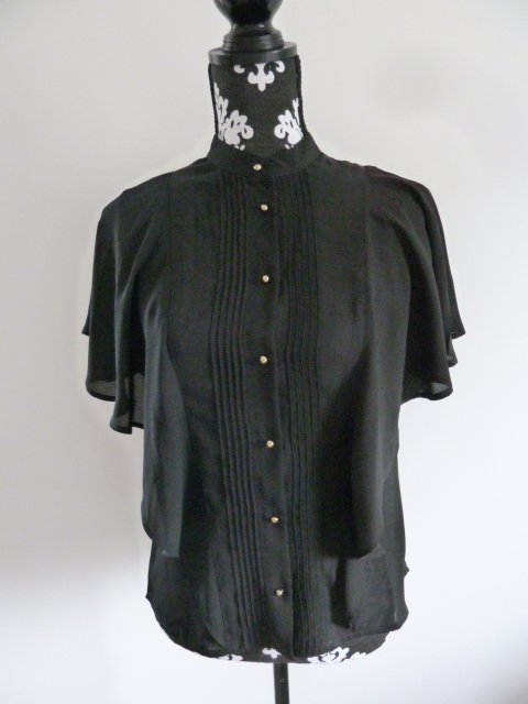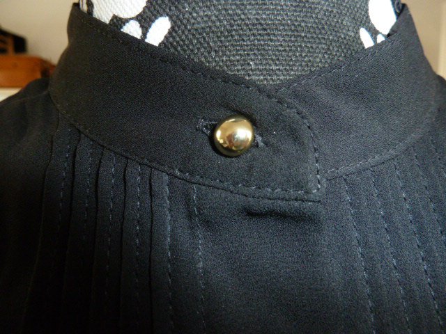 Die Bluse ist ganz leicht, hat einen super süßen kleinen Stehkragen, ein tiefes Schwarz und hübsche kleine goldene Knöpfe.