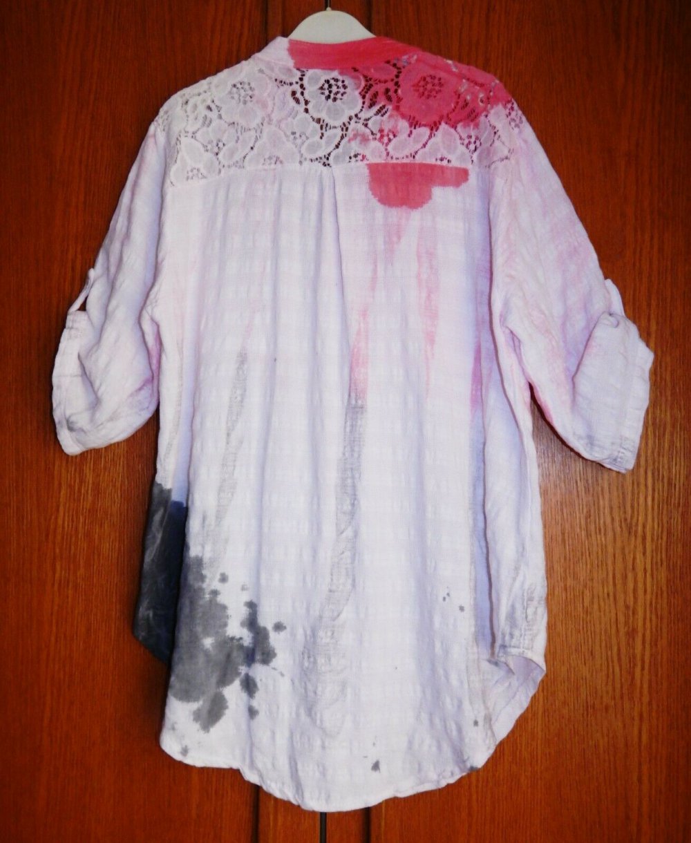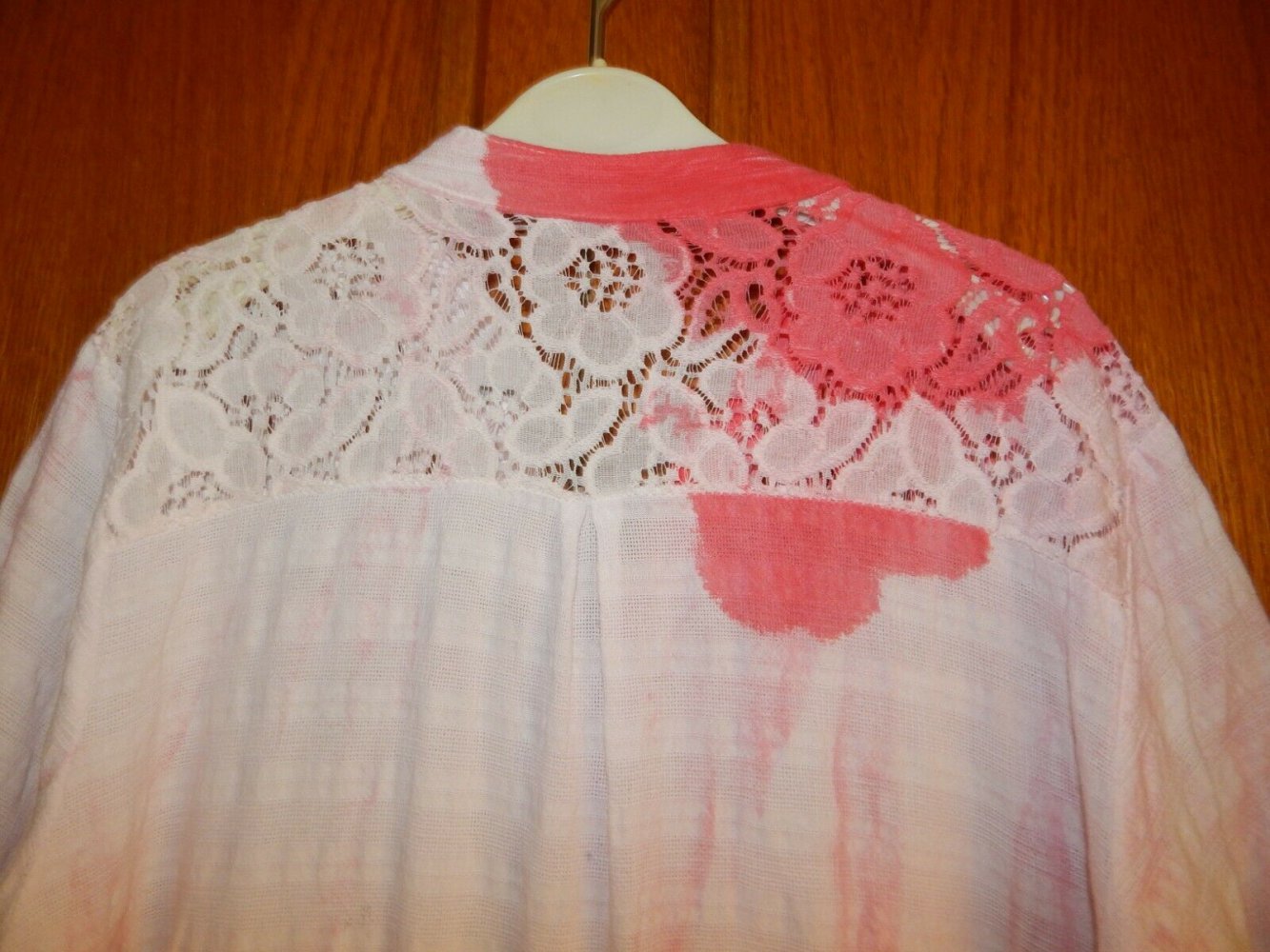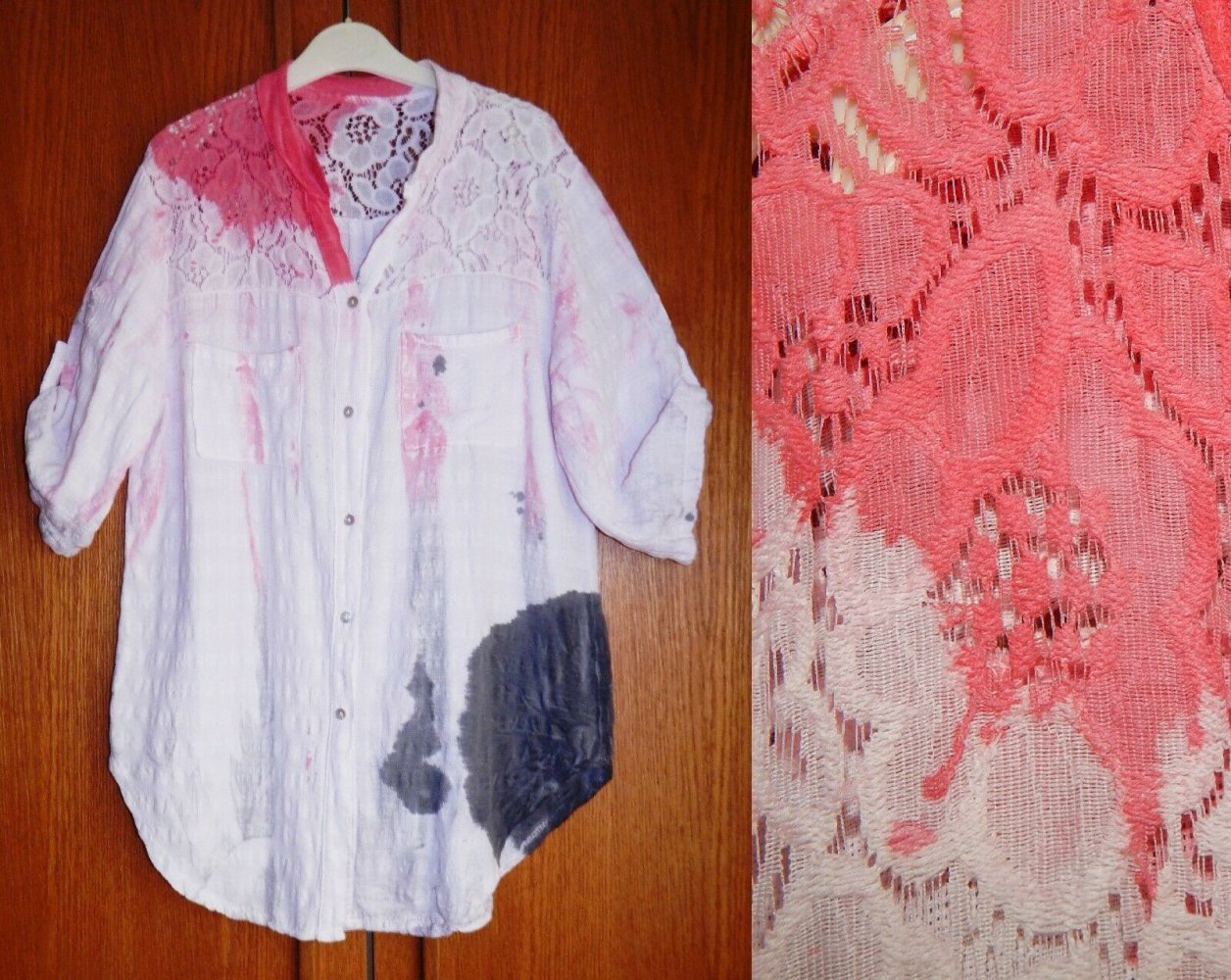 Biete diese tolle Bluse, in der Gr. 42-44. Die Bluse wurde nicht getragen, neu, ohne Etikett. Sie besteht aus Spitze, Rosa/Weiß/Grau, 2-Brusttaschen, Knopfverschluss an den Ärmeln und Perlmutterne Knöpfe. Hier noch einige Maßangaben: