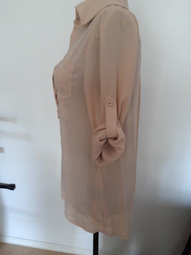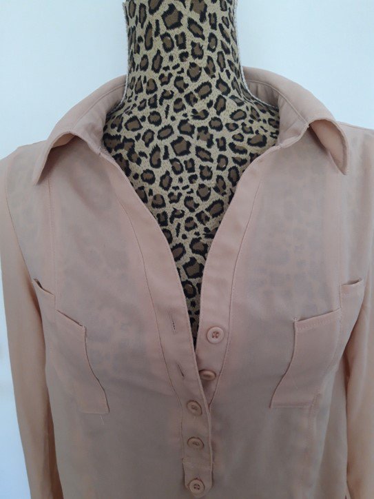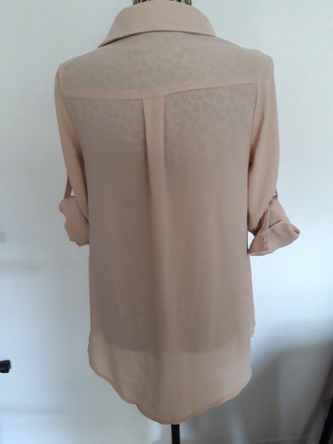 lange Knopfleiste, aufgesetzte Taschen auf der Brust, Länge der Bluse und der Ärmel bestimmbar, dank seitlichen Knöpfen. High-Low Schnitt. Hier und da ein paar Fäden gezogen, siehe Bilder