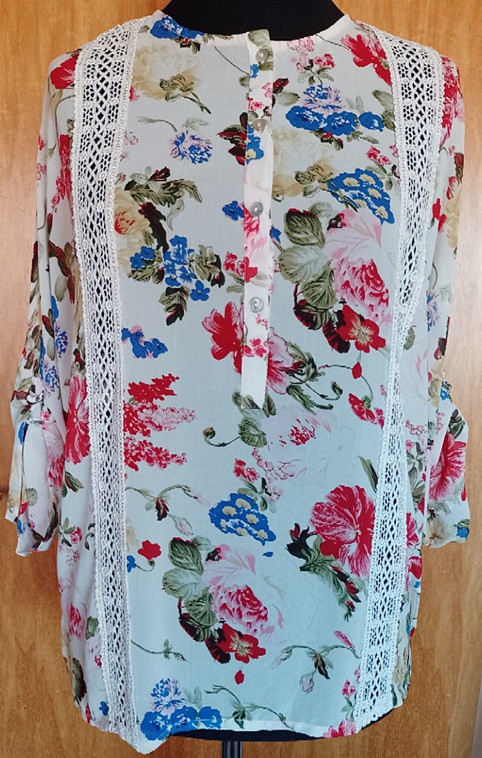 Die Bluse ist gerade geschnitten, hat lange Ärmel, die in der Länge reguliert werden können, seitlich kleine Schlitze und Spitze vorne.