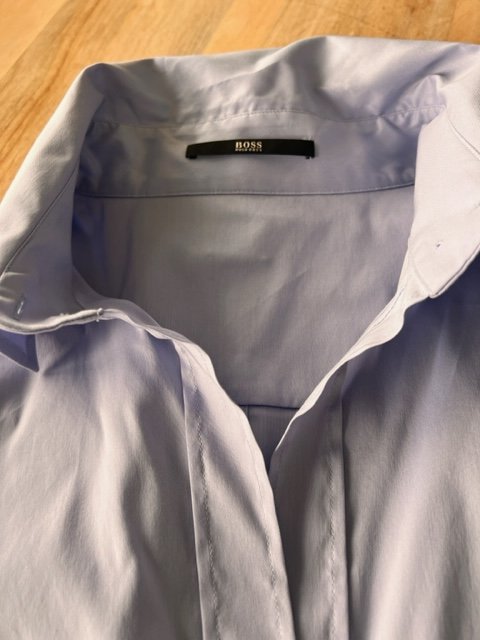 Die Damen-Bluse aus komfortablem Stretch-Canvas ist leicht tailliert und hat 2 lange Seiten Reissverschlüsse 40 cm, und der Vorderbereich hat einen V-Ausschnitt und keine Knopfleiste. Auf der Rückseite befindet sich im oberen Bereich das HUGO Boss Symbol. Die Ärmel haben 2 Knöpfe und der Stoff fühlt sich sehr leicht an und bestens geeignet für Business aber auch Freizeit Bereich. Die Bluse lässt sich leicht dehnen und hat einen perfekten Sitz. Die Farbe ist hellblau / leicht Helllila Schimmer. Die Rückenlänge hat 70 cm. Der Originalpreis belief sich auf 315 €.