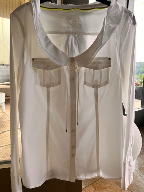Neu-nicht getragen; weisse Damen Sport Bluse von Marc Cain mit leichten verspielten Rüschenkragen