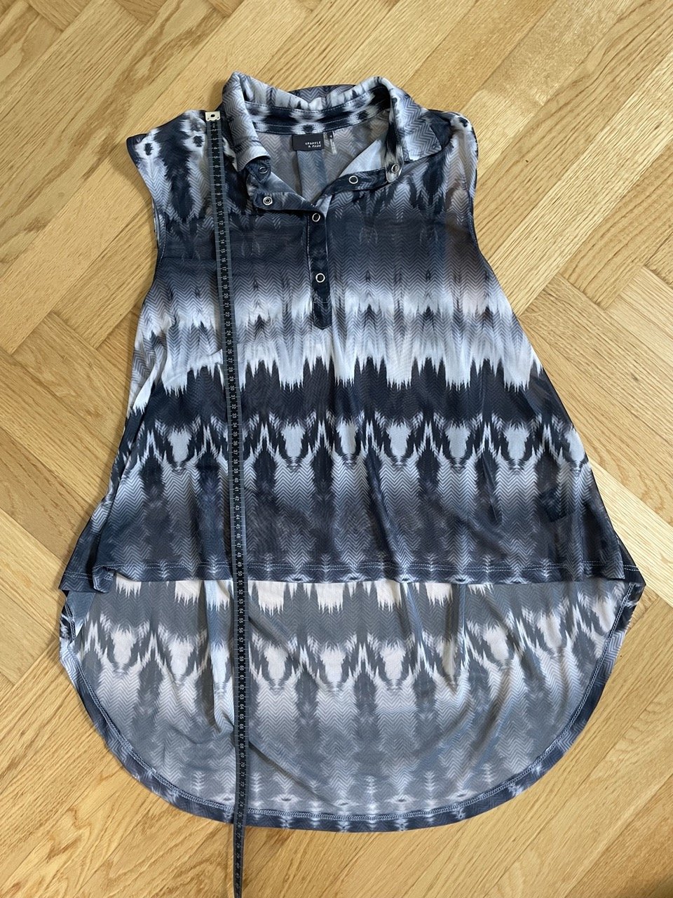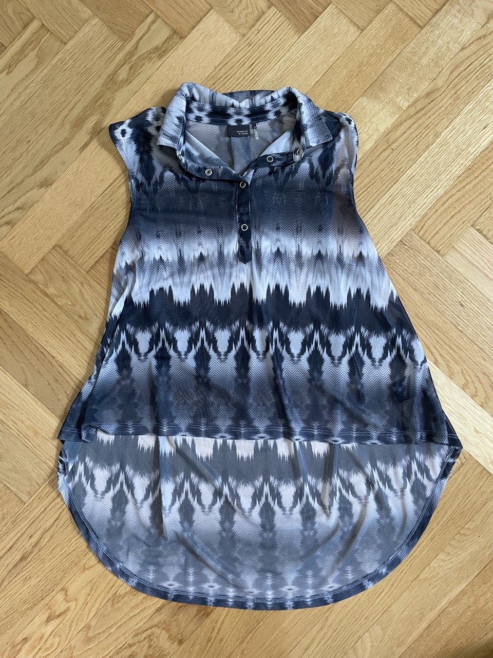 Coole gemusterte Bluse von Spargel&Fade. Sie ist asymmetrisch/vorn kürzer als hinten, hat einen kleinen Kragen und der Stoff ist transparent.