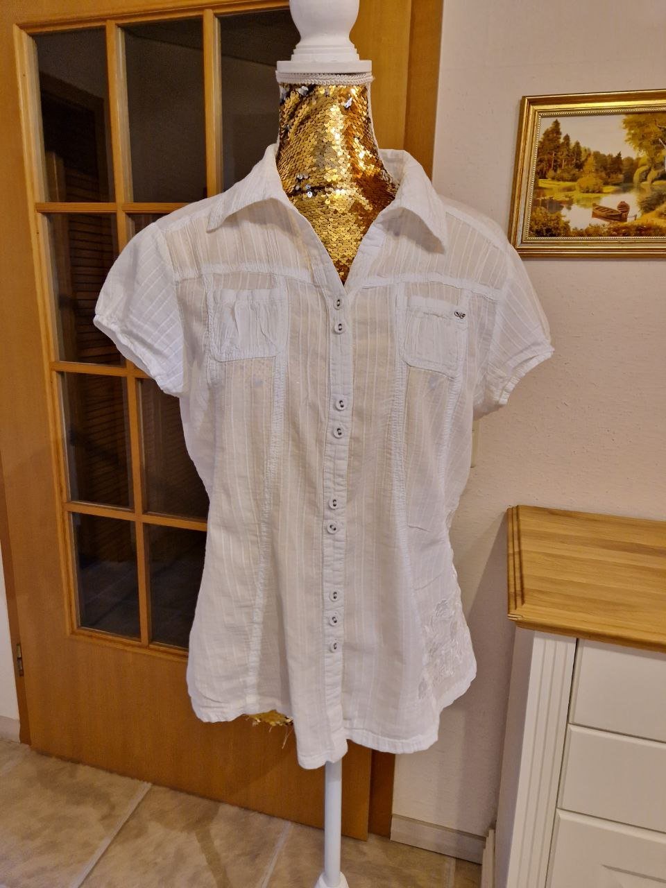 Kurze weiße karierte Bluse, Größe 42