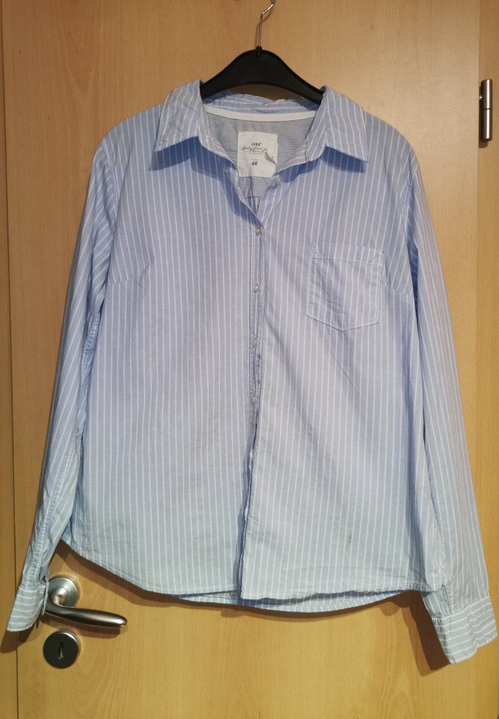 Ich biete eine blau weiß gestreifte Hemdbluse an. Diese ist von H&M, hat die Größe 46 und hat auf der linken Seite eine Brusttasche.
