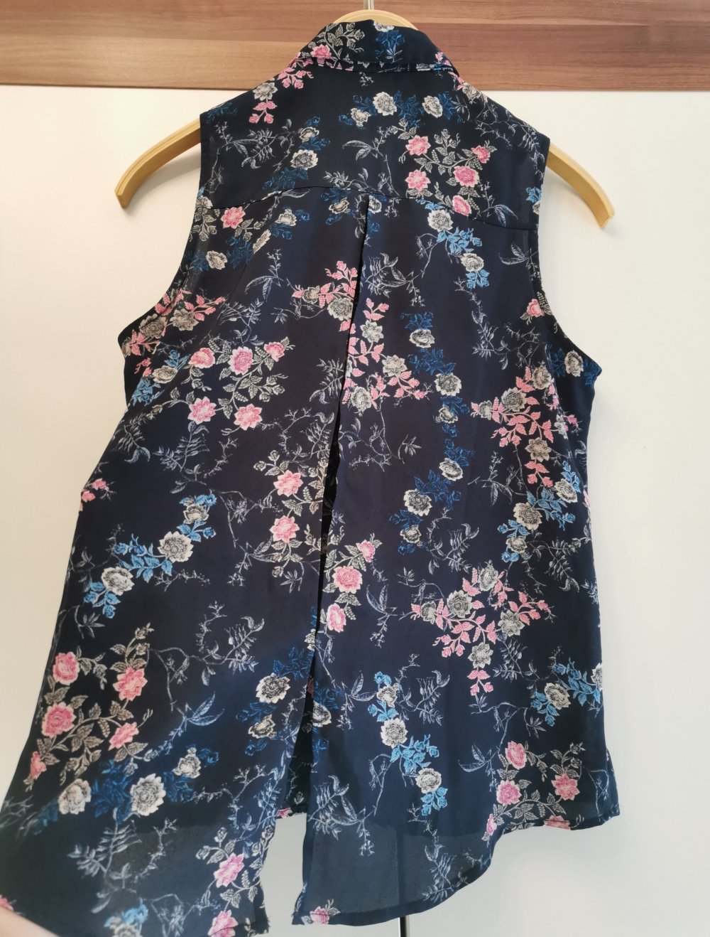 Schöne dunkelblaue Bluse mit rosa-weiß Blumenmuster in XS; nicht sehr transparent; mit Kragen und zu knöpfen; schöner, besonderer Rücken