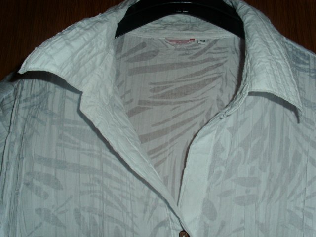 Biete hier eine kurzärmlige Bluse von Outfit in Größe 48 an. Sie ist weiß und hat hellgraue Blättermotive. Die Bluse besteht aus 55% Baumwolle und 45% Polyester. Vorn befindet sich eine durchgängige Knopfleiste mit Knöpfen in Holzoptik, ein Ersatzknopf ist noch an der Bluse vorhanden. Die Ärmel haben einen kleinen Umschlag. Sie wurde nur selten getragen und ist sehr gut erhalten.