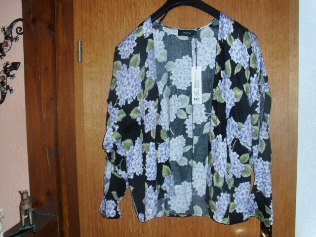 Biete hier eine Blusenjacke von Minkpink in Größe 44/46 an. Sie ist mit Gr. XS/S aangegeben, auch wenn sie Oversized getragen wird, fällt sie viel Größe aus. Die Blusenjacke wird offen getragen und sie besteht aus 100% Viskose. Sie ist schwarz und hat große zartblaue Blumenmuster. Die leichten Fledermausärmel haben modiche Cut Outs, ich hoffe das kommt auf den Fotos gut rüber. Da die Blusenjacke so groß ausfällt ist sie neu, ungetragen und noch mit Etikett versehen.