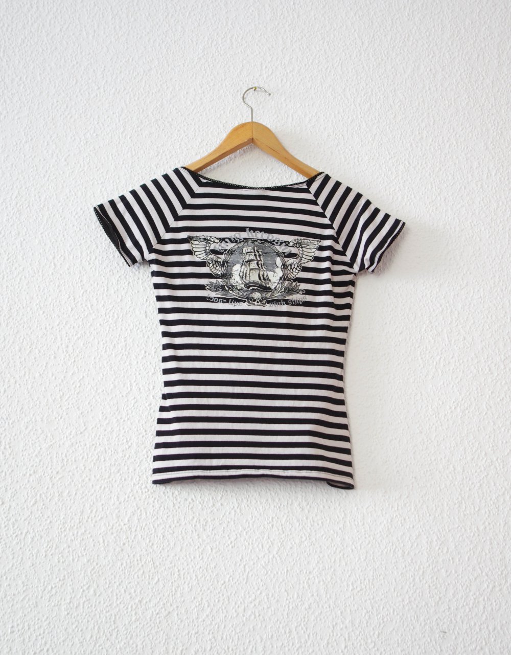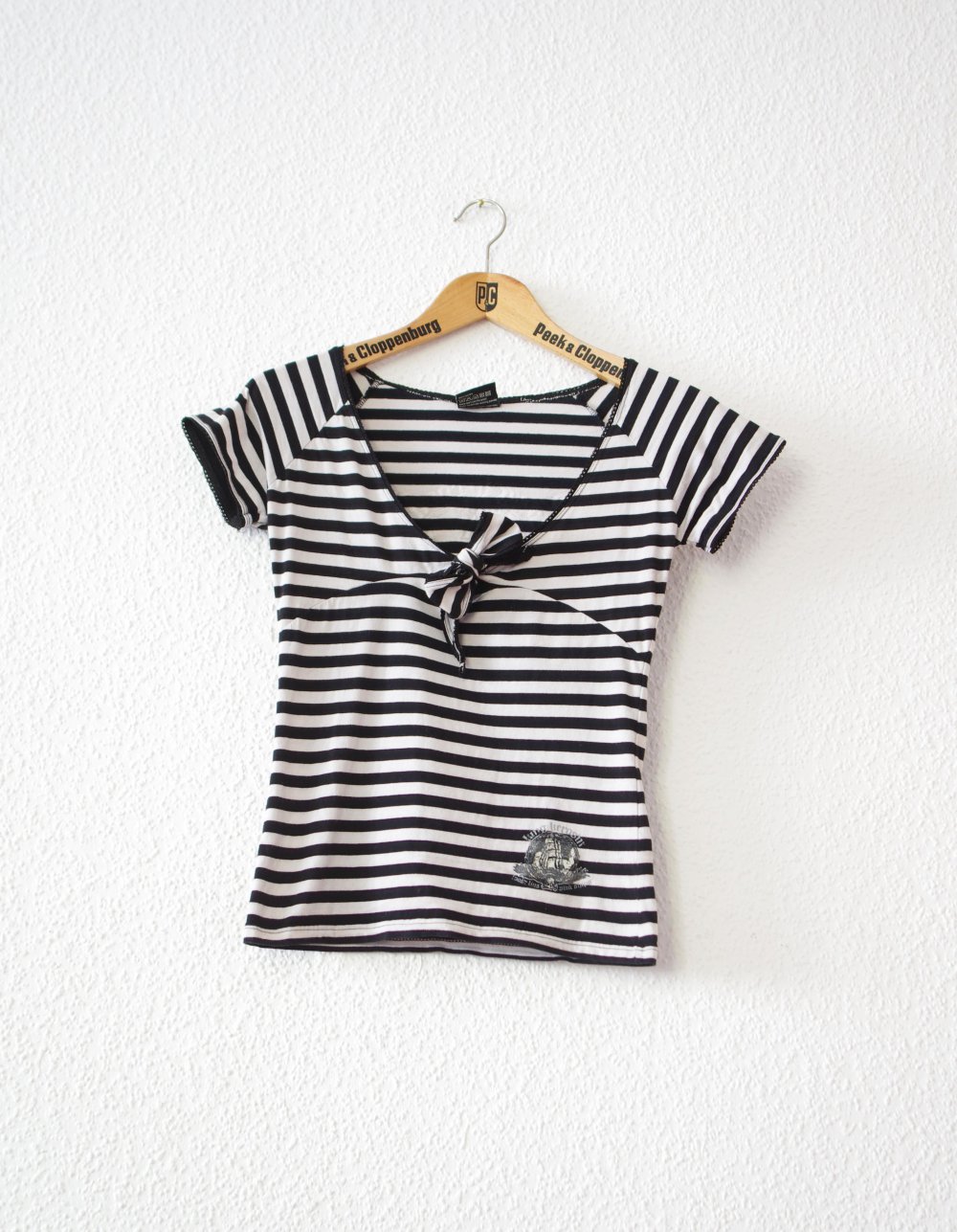 Süßes Sailor-Shirt von King Kerosin, vorn zum Binden und mit Front- und Backprint. Zierliche Spitzenverzierungen an Hals- und Ärmelsäumen. Wurde 2 Mal getragen, Zustand praktisch wie neu. Aus dem Besitz einer Freundin, der es leider nicht mehr passt. Größe S, fällt auch so aus. Stretchig, daher eventuell noch mit kleiner M tragbar.
