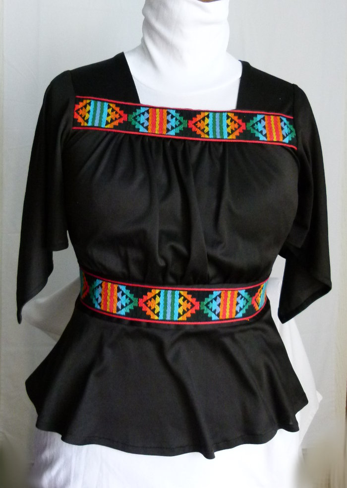 Tunika Shirt mit Bortenverzierung, schwarz bunt, aus den 70er Jahren, Boho Folklore Ethno Goa Hippie Festival Vintage 70s Retro