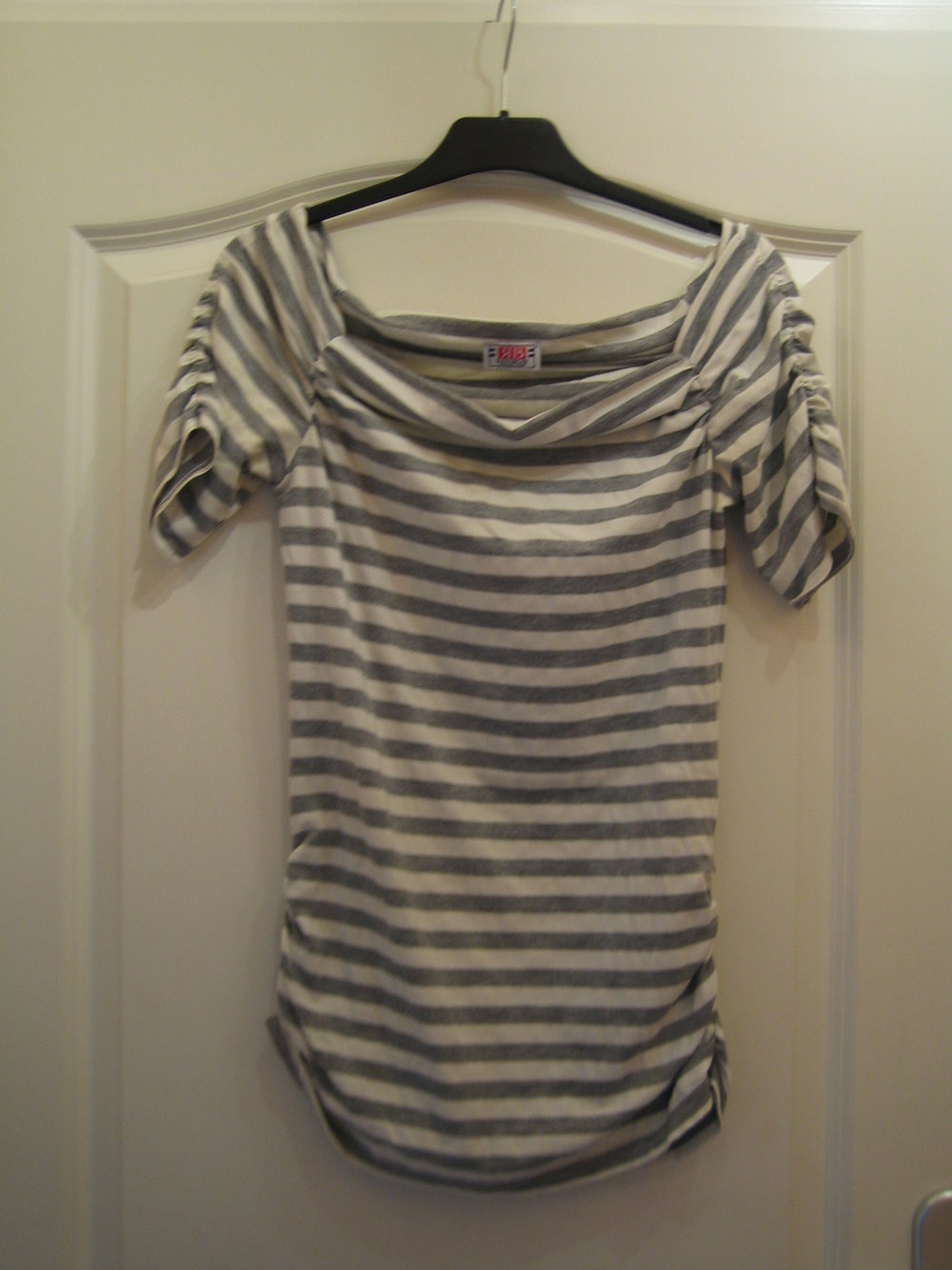 Schönes, länger geschnittenes grau/weißes T.Shirt. Schöne Raffung an den Ärmeln und unten an den Seiten. Toll fallender Ausschnitt.