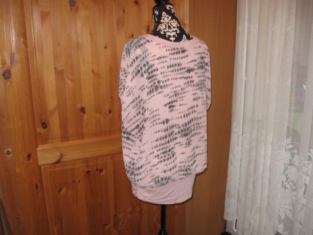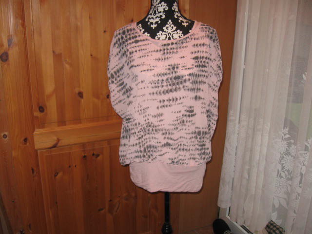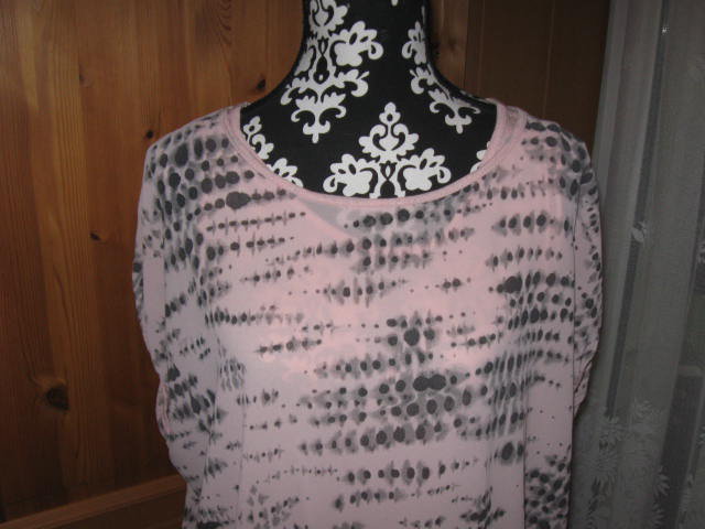 Biete ein tolles Long Shirt mit kurzen Fledermausärmeln und einem schönen Muster, in der Gr. XXL. Der genaue Farbton ist ein Rosa/Grau. Hier einige Maßangaben: