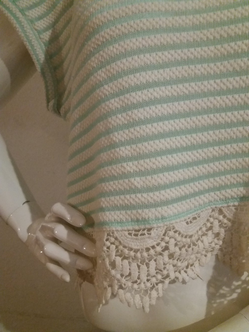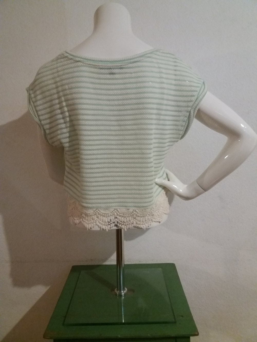 Crop Top mit weiß und mintgrünen Streifen, sowie Spitze unten am Saum, der Stoff ist leicht durchsichtig, da die Maschen recht grob sind (auf dem Bild zu sehen). Passt auch mit Größe 38.
