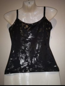 ein lila top mit schwarzen kleinen punkten und silberner schrift.