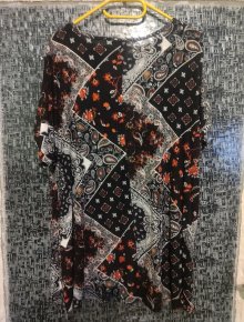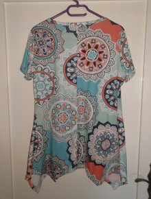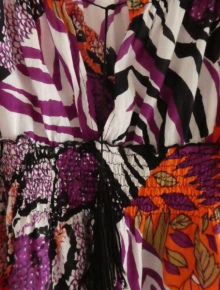 Schöne Vintage Bluse aus sehr leichtem, luftigen Stoff. Leicht taillierter Schnitt. Mängel: hinten oben am "Kragen" leicht gerissen, aber durch den bunten Stoff fast nicht erkennbar ( letztes Foto). Gr. 48/50