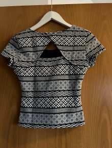 Ich verkaufe eine leger geschnittene Kurzarmbluse mit krempelbaren Ärmeln und weißen, schimmernden Knöpfen.