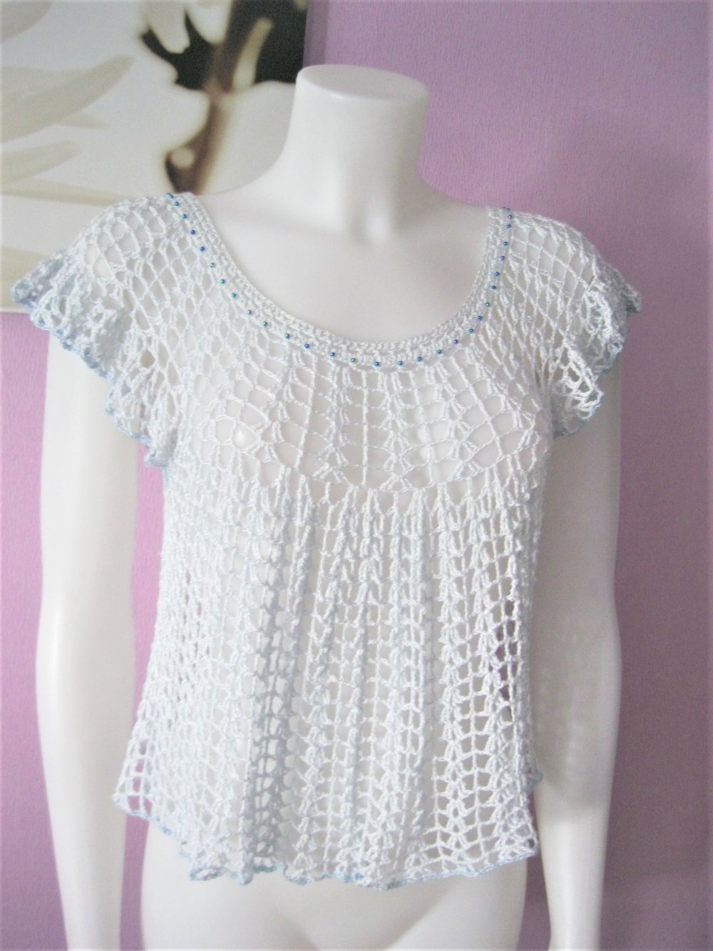 NEU Häkel-Shirt Bluse Baumwolle/Viskose Perlen blau Handmade S-L Hellblau