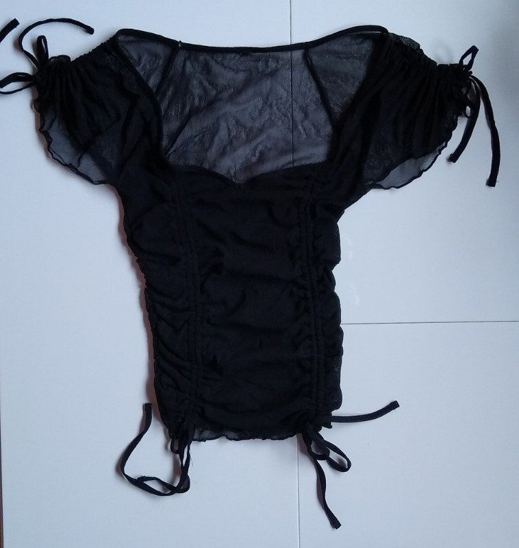 Ich verkaufe hier ein getragenes Netzoberteil in schwarz. An den Ärmeln hat es Schleifchen und vorne kann man das Oberteil durch Schnüre raffen. Es ist ein knappes Oberteil mit der Raffung kann man es auch bauchfrei tragen.