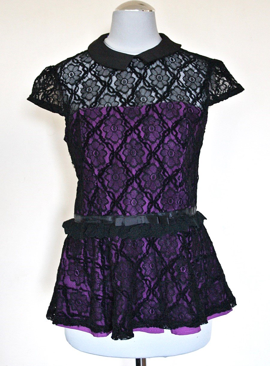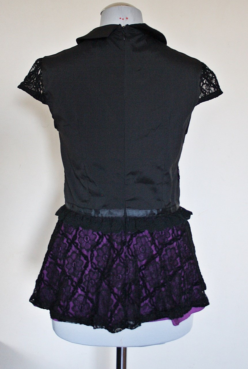 Leichte, violette Bluse mit schwarzer, darüber liegender Spitze. Oberhalb der Brust, sowie an den kurzen Ärmeln ist die Bluse durchlässig, am Rücken ist sie schwarz und blickdickt. Die Bluse besitzt zudem einen kleinen Kragen und ein schmales (nicht abnehmbares) Taillienband, darunter fällt der Stoff schößchenartig. Ausgewiesen mit der Gr.S, sie passt mit Gr.34 und Gr.36.