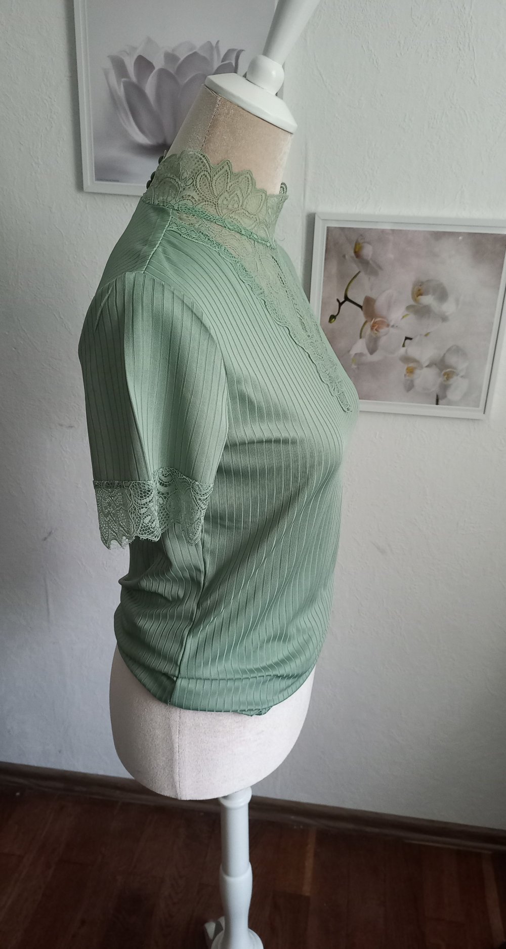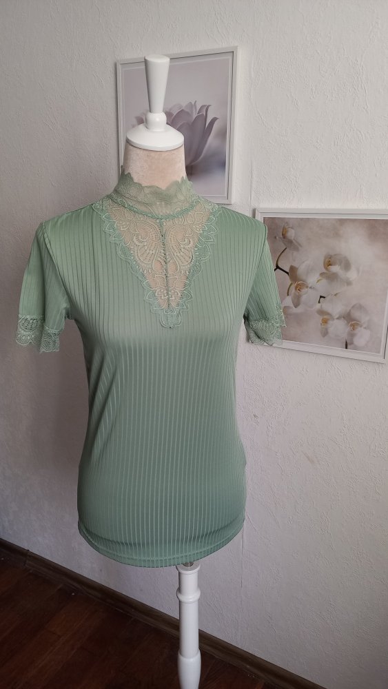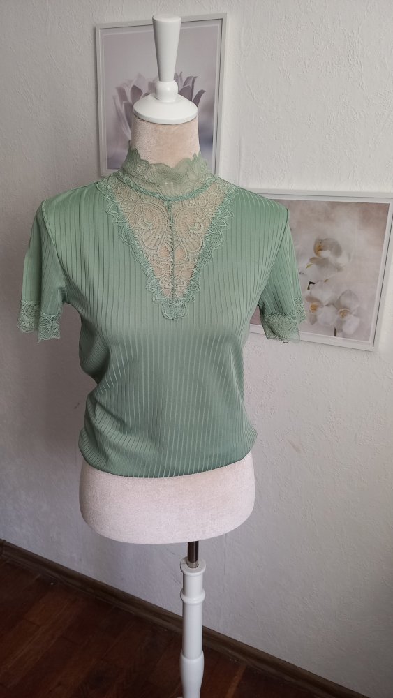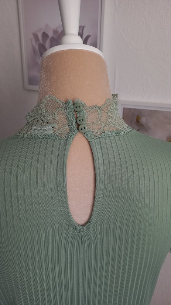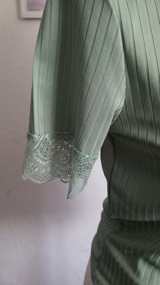 Mit Spitzeneinsatz am Dekolleté und Spitzenbündchen an den Ärmeln