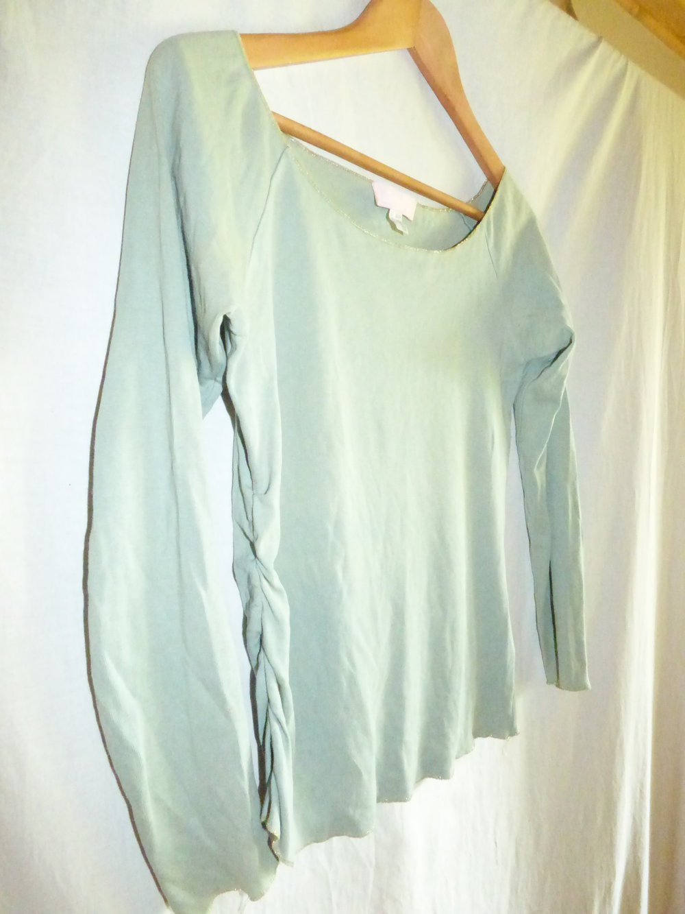 Das Shirt ist im Stil der 20er Jahre, es hat eine hübsche blassgrüne/blassblaue Farbe, einen Goldrand am Ausschnitt, den Ärmelsäumen und am unteren Rand.