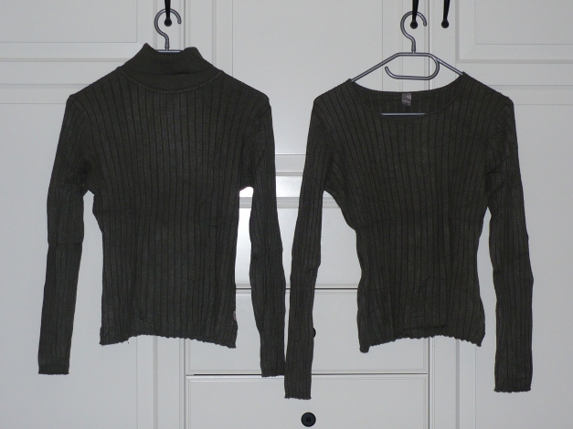 Die beiden Teile sind in einem guten, wenig getragenem Zustand. Sie sind angenehm zu tragen, weich auf der Haut. Leider liegen sie nur im Schrank rum, da ich einfach nicht mehr zu dieser Farbe greife. Außerdem besitze ich beide noch in schwarz.^^