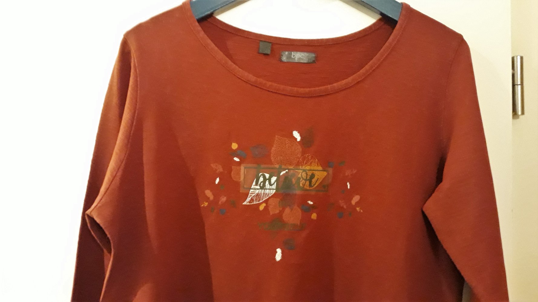 Schönes Damenshirt von bpc, Langarm, Gr.40/42, in rostbraun mit schickem herbstlichen Aufdruck, 100% Baumwolle, aus gepflegtem Nichtraucherhaushalt,