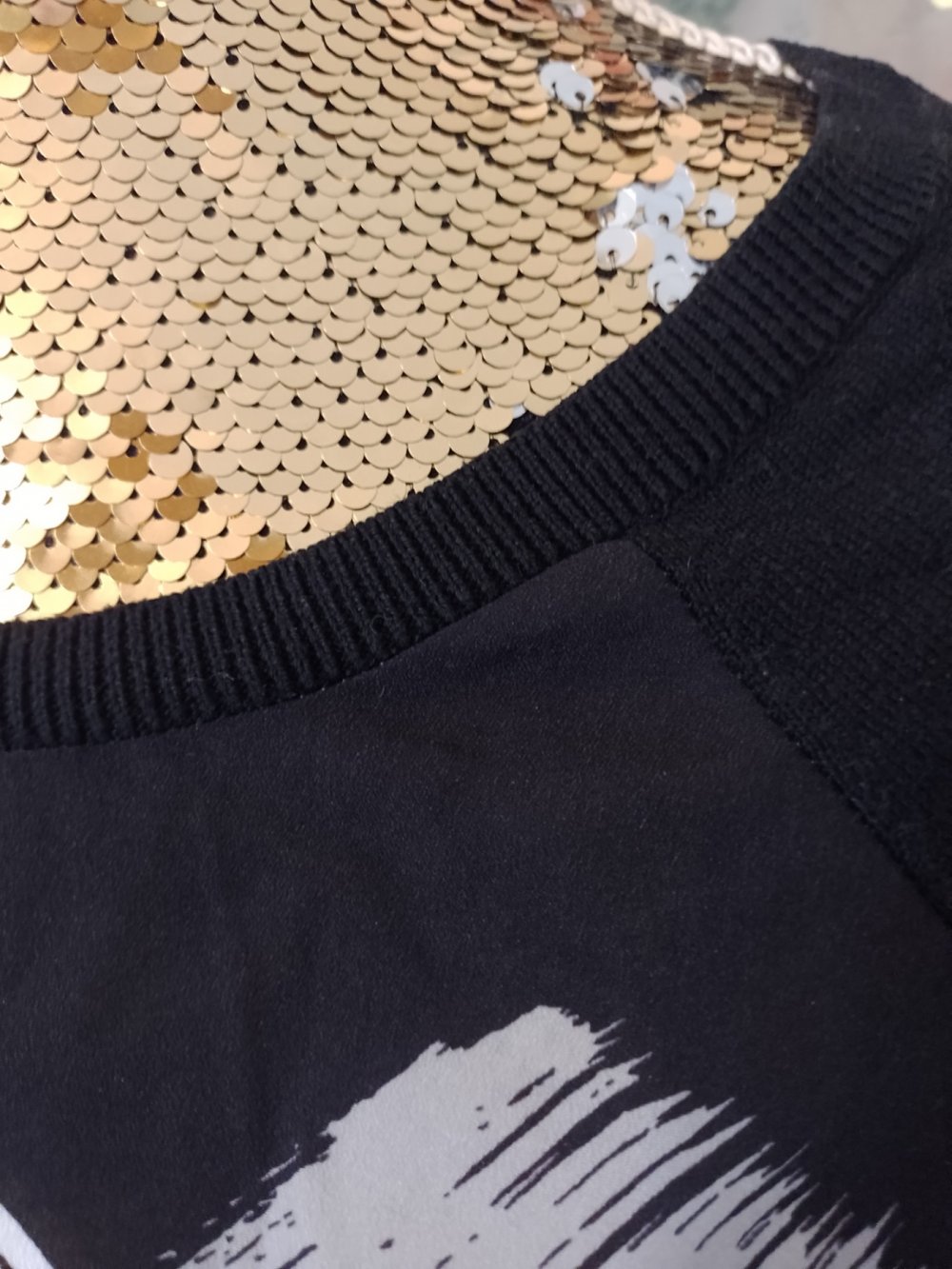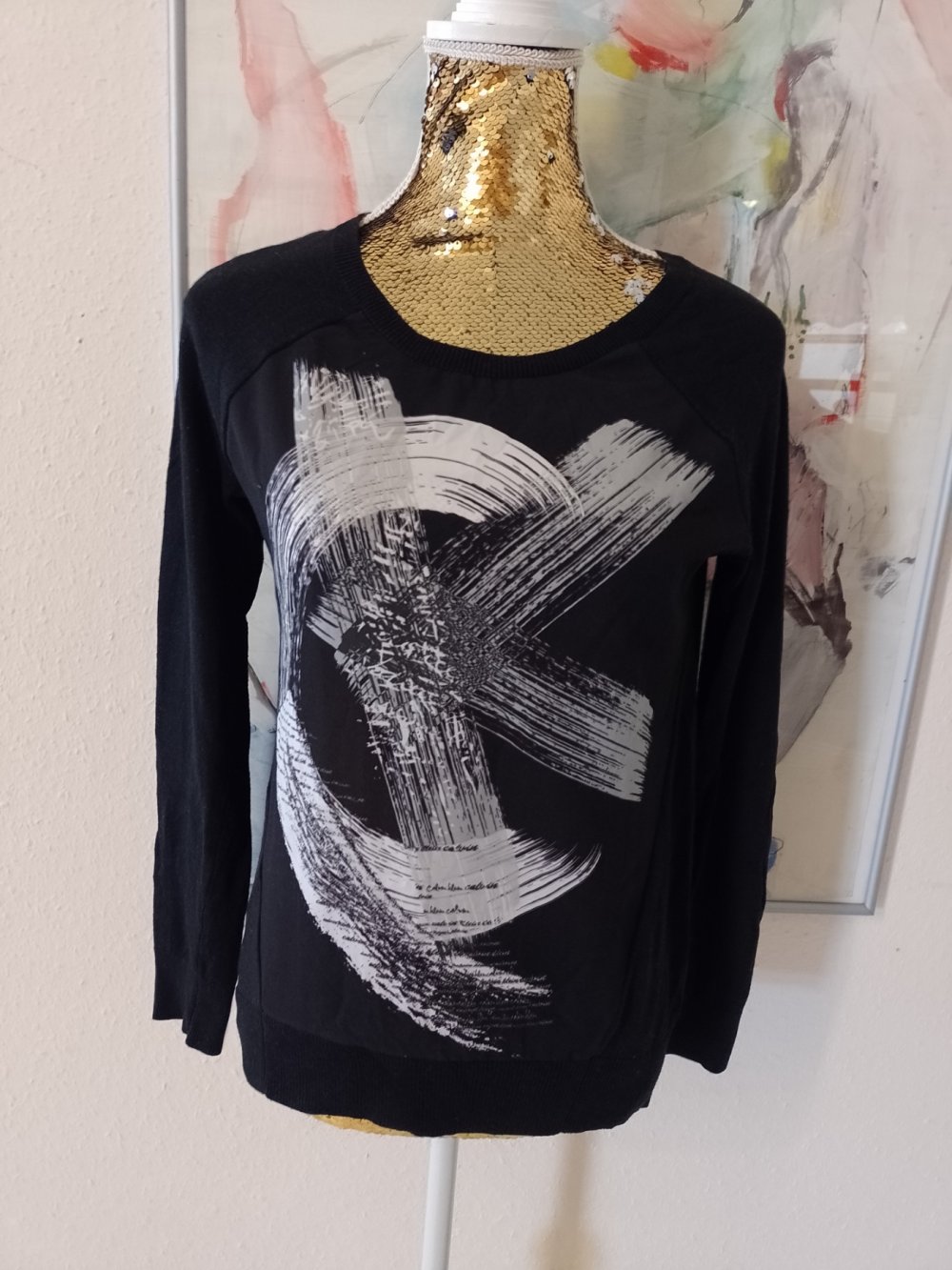 Shirt, Langarmshirt, Gr. 34 bzw. ca. Gr. XS, schwarz/bunt/silber