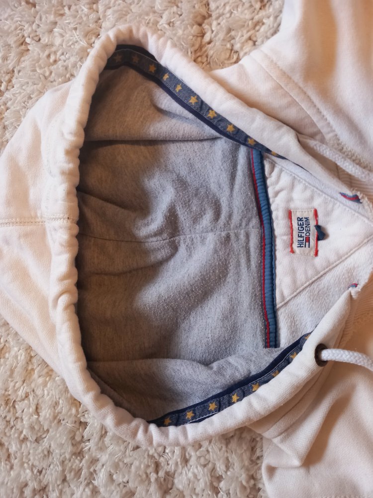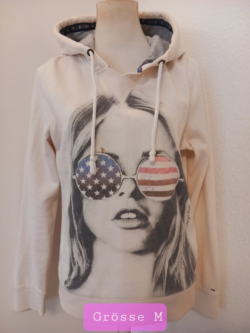 Tommy HIlfiger Kapuzen Sweatshirt Pullover Pulli Sweatter Hoodie Hoody Gr M 38 weiß blau rot black Front Print