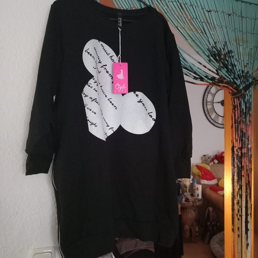 Biete dieses NEUE neckische, langärmelige, lange, angeraute Sweatshirt mit Mickey Druck im Brust Bereich. An der linken Seite bis zur Achselhöhe befindet sich ein Reißverschluss, wenn dieser geöffnet wird, kommt der Tüll Einsatz zum Vorschein, dadurch kann man dieses Teilchen, auch als Winter Kleid tragen. Hier noch einige Maßangaben: