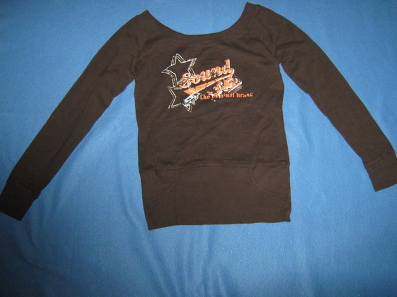 Ausgefallen * stylisch * Off Shoulder * Carmen- Ausschnitt * Glitzer Print * DESIGNER * Longsleeve * Langarm * T- Shirt * Gr. 36- 38/ S * schoko- braun * orange *