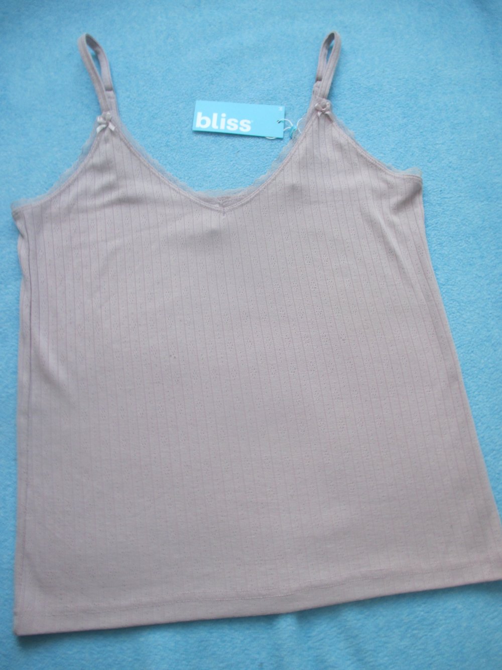NEU mit Etikett * Edel * Schleifen- Lace- Spitzen * Romantik * Ajour * Spaghetti * Träger- Top * T- Shirt "bliss" Gr. 38- 40/ S- M * alt- rosé *