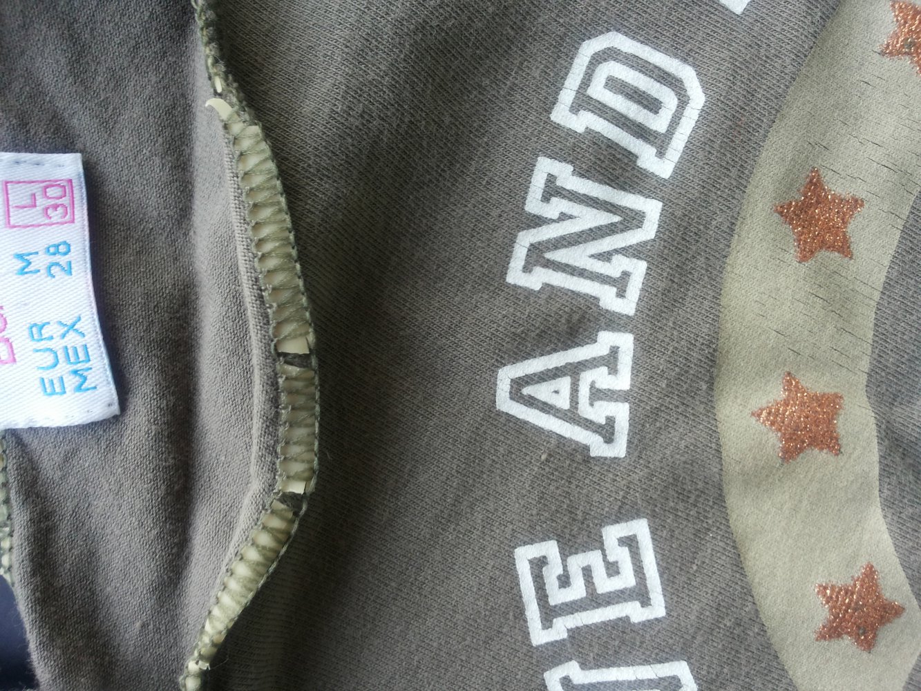 Zustand: Der Print ist ganz leicht brüchig. Das Gummi oben am Saum ist auch brüchig, aber wie man sieht kann man es trotzdem noch gut tragen.