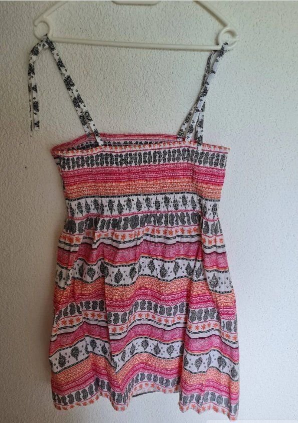 Das Kleid ist aus Baumwolle gefertigt und hat ein buntes, sommerliches Muster.