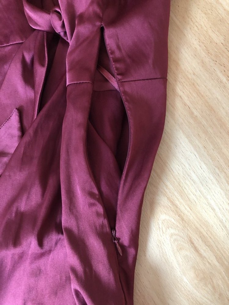An der Seite befindet sich ein Reißverschluss, vorne kann es etwas verknotet werden.