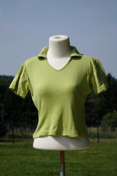 - Ein T-Shirt mit kurzen Ärmeln und Polokragen, ebenfalls hellgrün. Grössenangabe im Poloshirt: 34/36, Länge (ab Schulter): ca. 45cm.