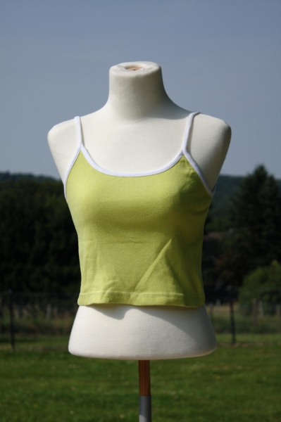 - Ein kurzes ärmelloses Spaghettiträger-Top in hellgrün mit weiss eingefasstem Ausschnitt und weissen Trägern. Grössenangabe im Top: S (kann als Gr. 36 gut getragen werden), Länge (incl. Träger): ca. 41cm.