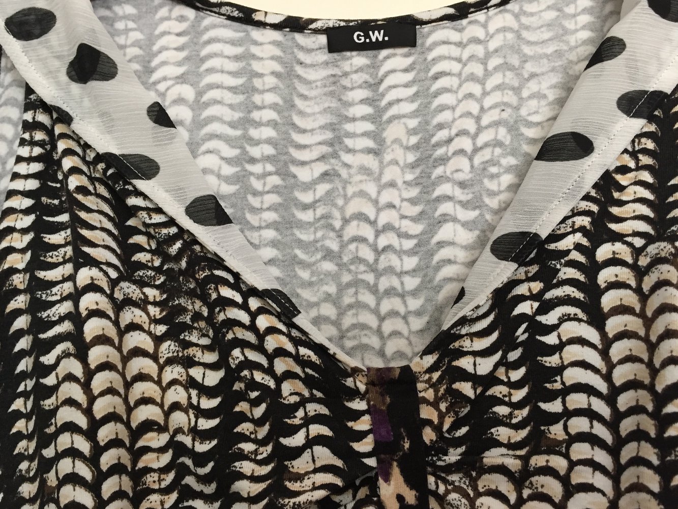 Ein ärmeloses T-Shirt im interessansten Materialmix, in schwarz-weiß-beige, überraschende Details