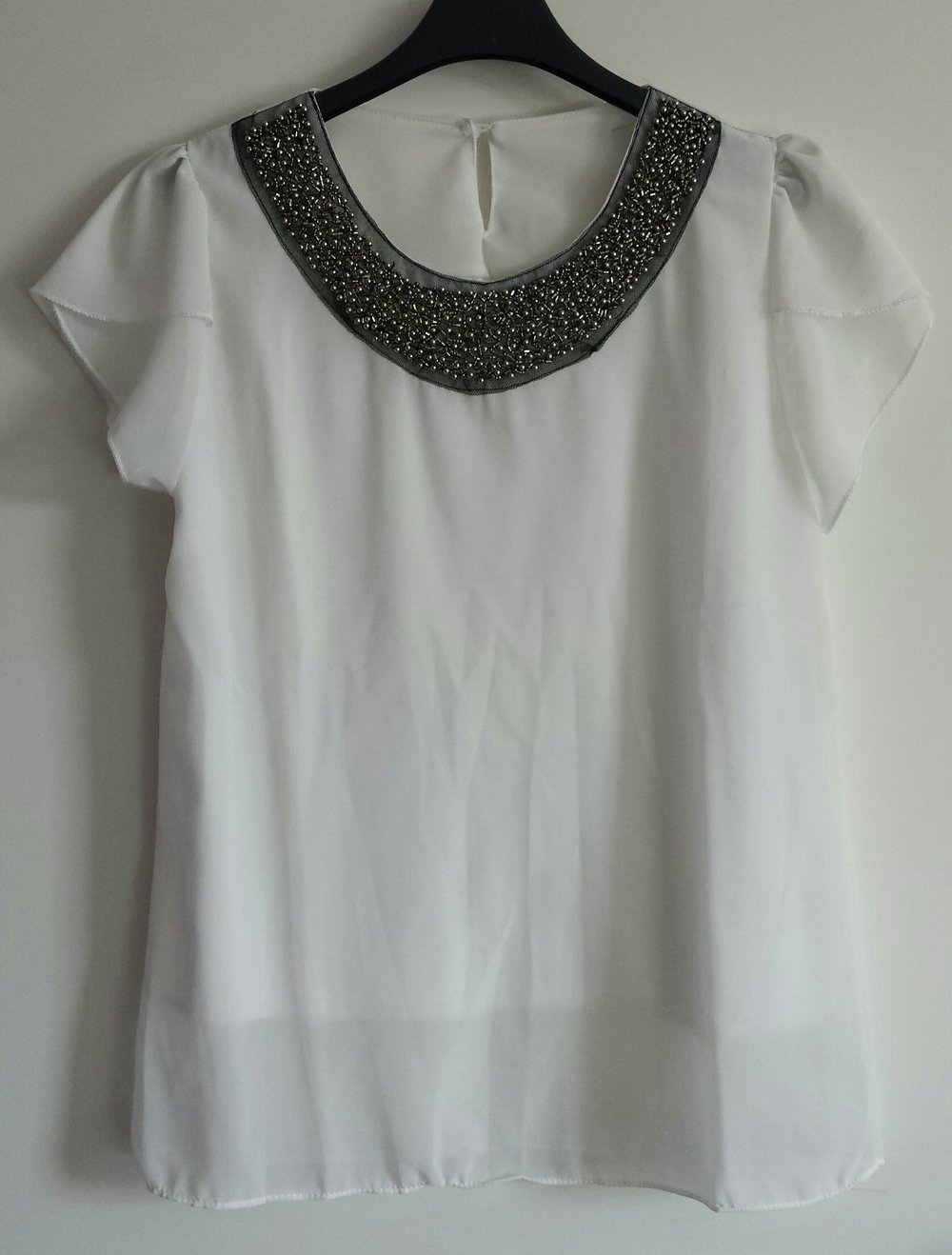 Top aus Chiffon mit Tulpenärmeln und silbernen Perlen entlang des Ausschnitts, hinten mit einem Knopf verschließbar. Blickdicht durch eine beidseitige doppelte Lage. Nicht getragen.
