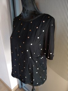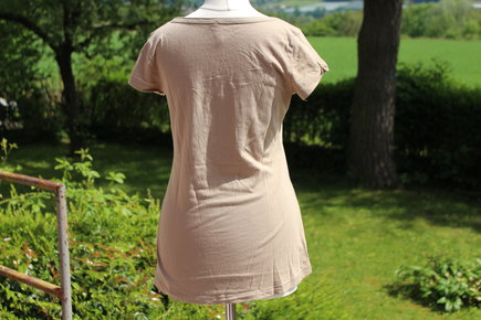 Sportiv und gut kombinierbar. Mit Rundhals und Halbarm in Größe 38. Das Rückenteil ist uni beige.